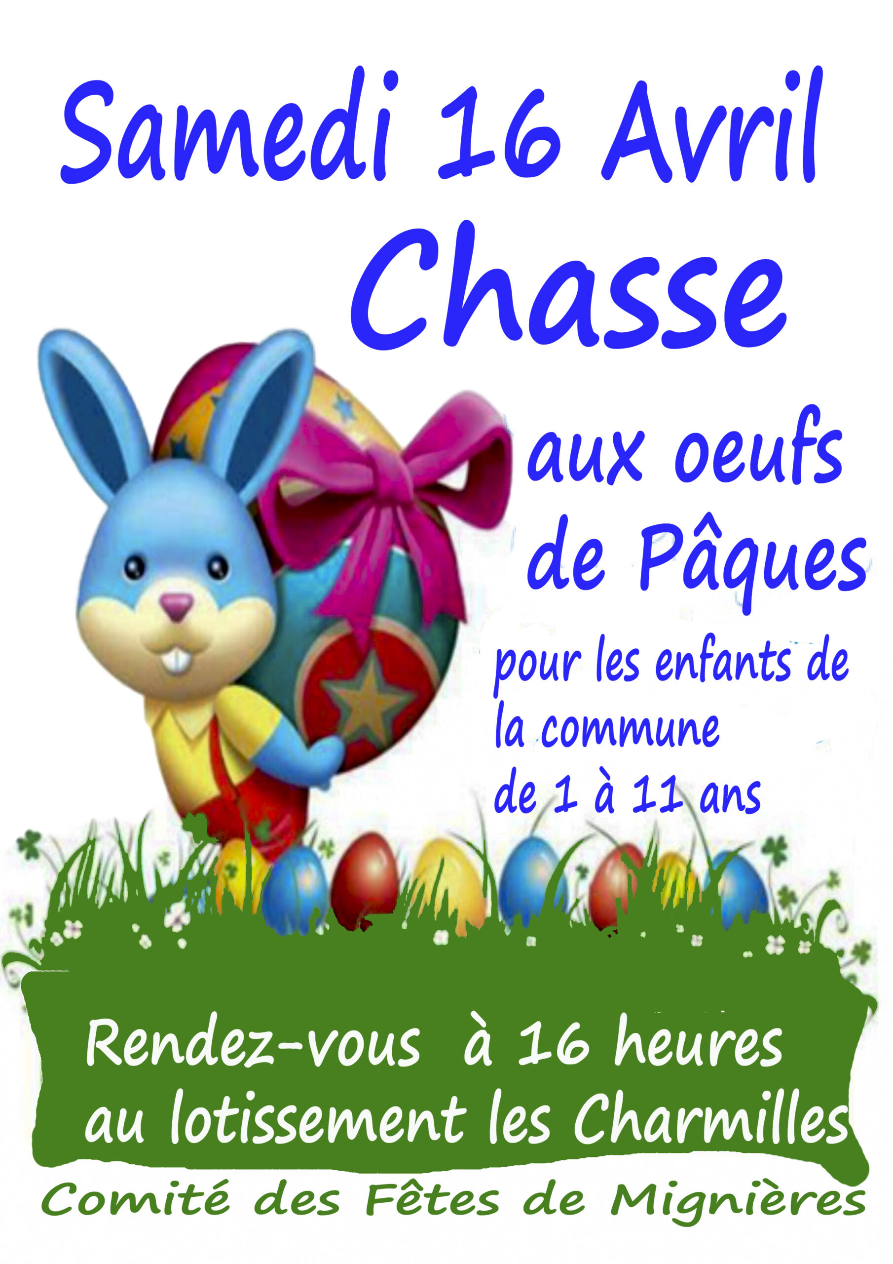 Pour les enfants de la commune âgés de 1 à 11 ans, rendez-vous le Samedi 16 Avril 2022 à 16 heures au lotissement les Charmilles pour la chasse aux œufs.