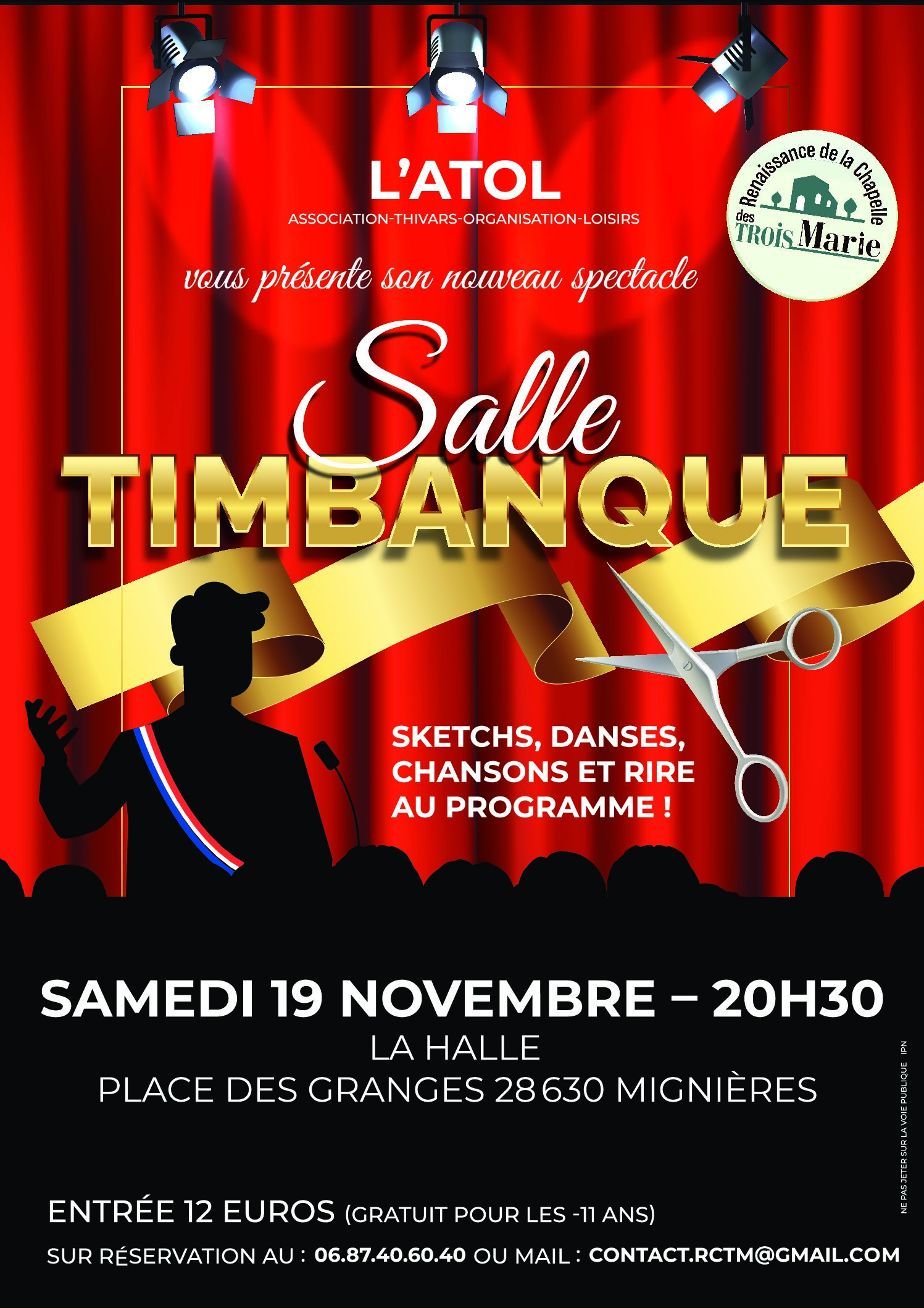 L’ Association Thivars Organisation Loisirs (ATOL) vous présente son nouveau spectacle SALLE TIMBANQUE organisée au profit de l’Association “Renaissance de la Chapelle des Trois Marie” le Samedi 19 Novembre à 20h30 Place des Granges à Mignières.