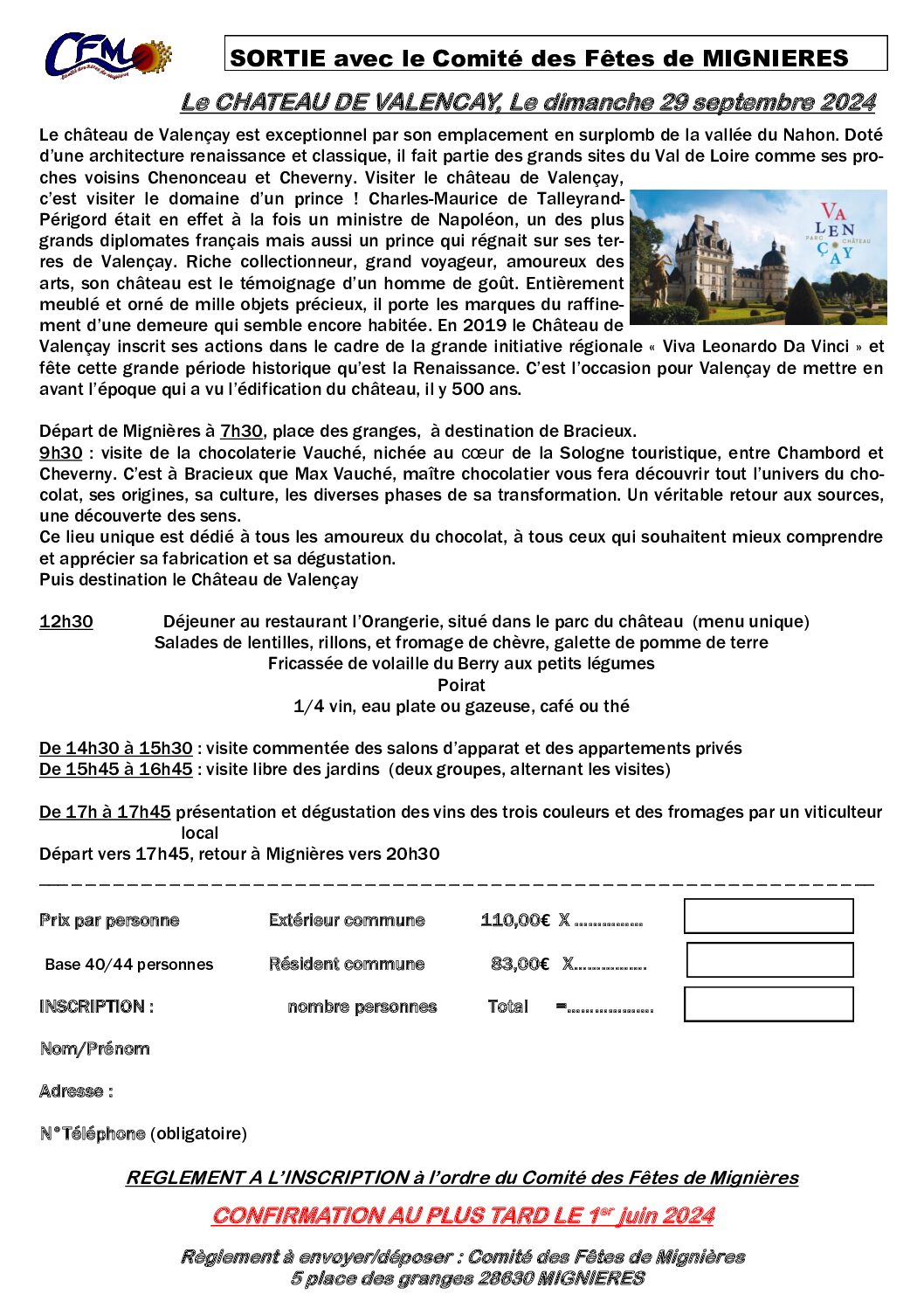 Le Comité des Fêtes de Mignières vous propose le Dimanche 29 Septembre 2024 une journée au Château de Valençay.
