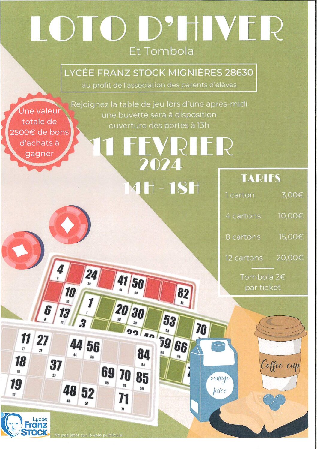 L’association des parents d’élèves du Lycée Franz Stock organise son loto d’hiver et sa tombola le Dimanche 11 février 2024 de 14h-18h