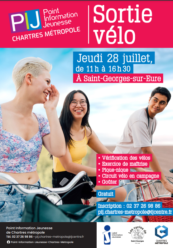 Le point Information Jeunesse (PIJ) organise le Jeudi 28 Juillet 2022 une Sortie Vélo de 11h à 16h30 à Saint-Georges-sur-Eure.