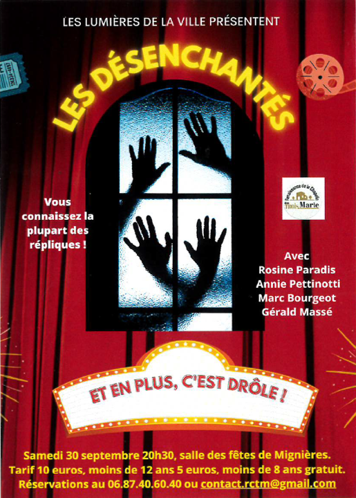 L’association “Renaissance de la Chapelle des Trois Marie” vous propose son Spectacle ” Les Désenchantés” le SAMEDI 30 SEPTEMBRE 2023 à 20h30 Salle des fêtes “LE SILO” à Mignières.